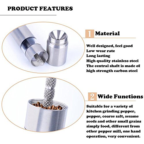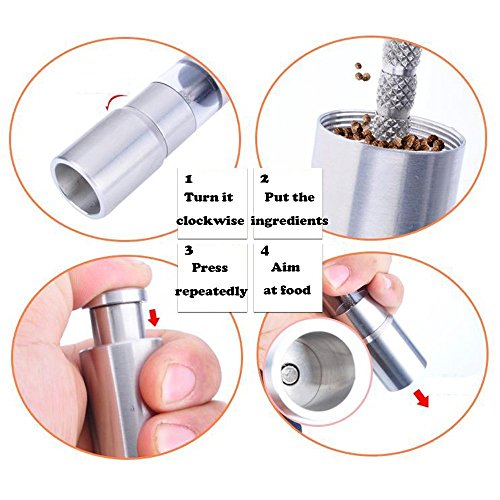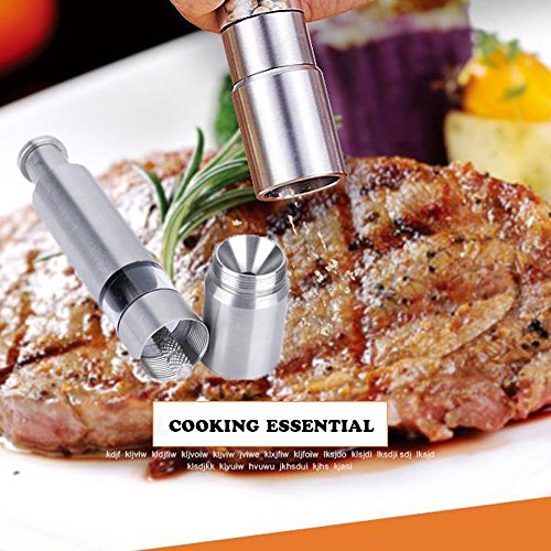 ◆INNOVATIVE DESIGN:Sleek body and push button design allows your elegant one hand operation on dinner table.Satin stainless steel casing and clear windows to see salt and peppercorns.