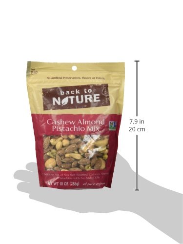 -. Binding : Grocery -. Brand : Back to Nature -. EAN : 0759283310206 -. Feature : Natural Certified / Only Natural Ingredients / No high fructose corn syrup -. IsAdultProduct : 0 -. Label : Back To Nature Foods Company -. Manufacturer : Back To Nature Foods Company -. MPN : KFT-255 -. NumberOfItems : 1 -. PackageQuantity : 1 -. PartNumber : KFT-255 -. ProductGroup : Grocery -. ProductTypeName : GROCERY -. Publisher : Back To Nature Foods Company -. Size : 10 oz -. Studio : Back To Nature Foods Company -. Title : Back To Nature Cashew Almond Pistachio Mix -. UPC : 819898013005