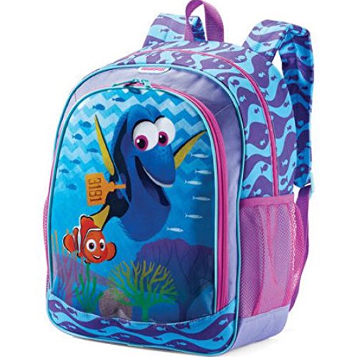 -. Binding : Office Product -. Brand : Disney -. Color : blue, pink, white, yellow, orange -. Department : boys -. EAN : 0644391778119 -. Feature : Measures 12"W x 16"H x 5"D / Dory and Nemo ocean print; bright colors / Large and medium zip compartment; padded adjustable straps / Mesh pockets for pens, pencils, school supplies or water bottle / Boys and girls school or travel bag -. IsAdultProduct : 0 -. Label : American Tourister -. Manufacturer : American Tourister -. MPN : 74727-5320D -. PackageQuantity : 1 -. PartNumber : 74727-5320D -. ProductGroup : Toy -. ProductTypeName : TOYS_AND_GAMES -. Publisher : American Tourister -. Size : large -. Studio : American Tourister -. Title : American Tourister Disney Finding Dory 16-inch Backpack - Kids -. UPC : 644391778119