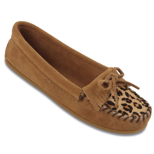 Minnetonka gives you that classic moccasin style with unmatchable comfort. Moccasin features a suede leather construction with leopard print and whipstitching details around foot. Suede leather kiltie and tie. Slip-on style. Imported. As an authorized retailer of Minnetonka Moccasin products, we cannot accept orders from outside the United States for Minnetonka products. We are very sorry for any inconvenience this may cause you.Feature