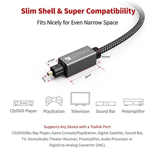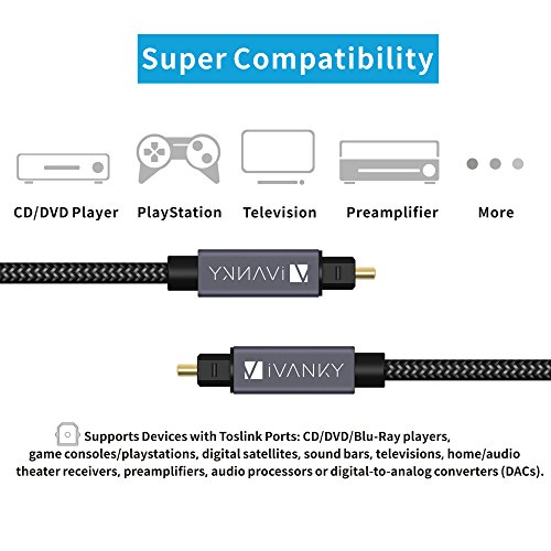 iVanky Digital Optical Cable works with devices with Toslink ports, like CD/DVD/Blu-Ray players, game consoles, digital satellites, sound bars, televisions, home/audio theater receivers, preamplifiers, audio processors or digital-to-analog converters (DACs).