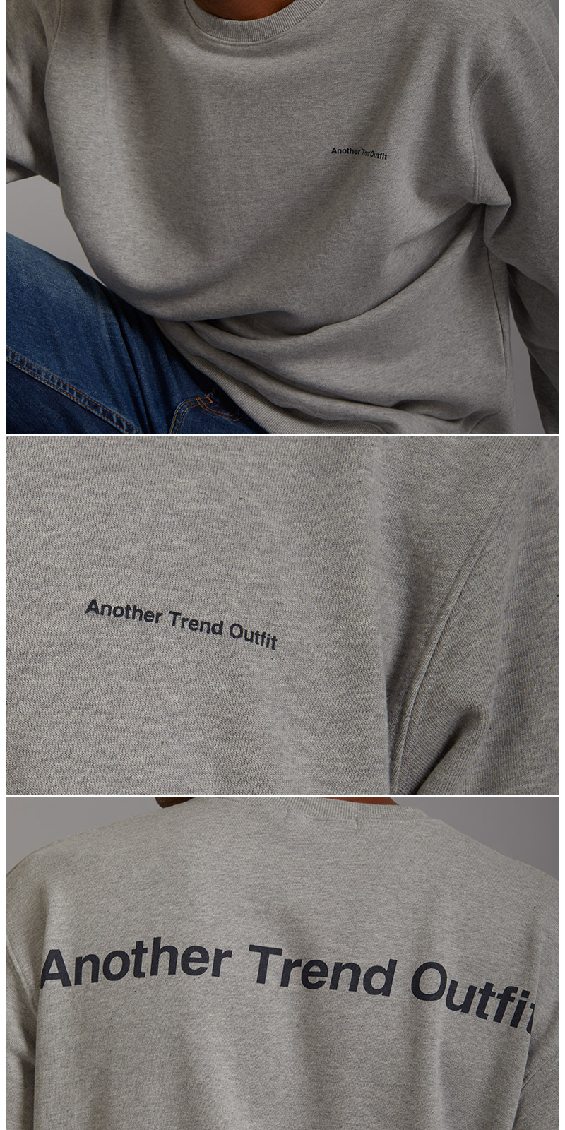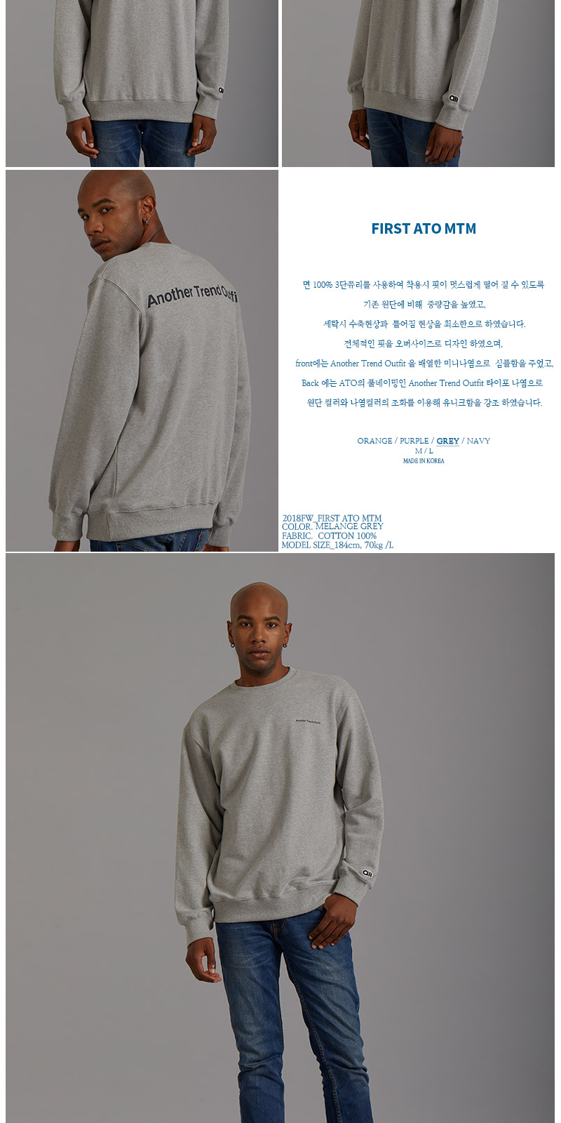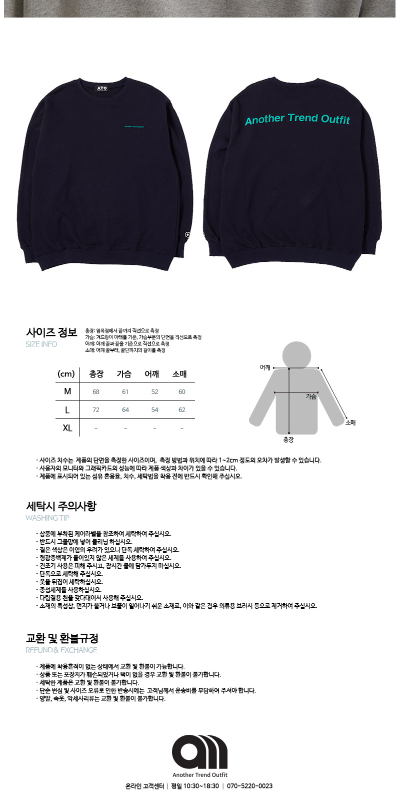 | 면 100% 3단쮸리를 사용하여 착용시 핏이 멋스럽게 떨어 질 수 있도록 기존 원단에 비해 중량감을 높였고, 세탁시 수축현상과 틀어짐 현상을 최소한으로 하였습니다. 전체적인 핏을 오버사이즈로 디자인 하였으며, front에는 Another Trend Outfit 을 배열한 미니나염으로 심플함을 주었고, Back 에는 ATO의 풀네이밍인 Another Trend Outfit 타이포 나염으로 원단 컬러와 나염컬러의 조화를 이용해 유니크함을 강조 하였습니다. |