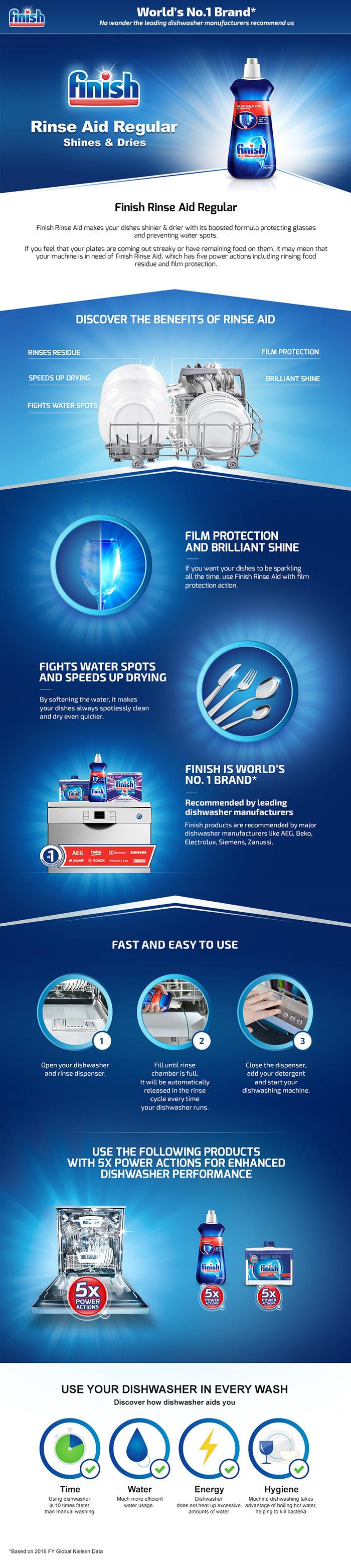 New and improved Finish Diamond Shine Rinse Aid delivers superior shine on glasses and dishes. Its also the No. 1 recommended rinse aid for appliances by LG, Siemens, Electrolux, Beko, Bosch and many more.