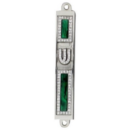 Mezuzah - Handmade Jeweled Home Blessing Cover, Pewter With Turquoise Stone and White Stone Border, 7 Centimeters