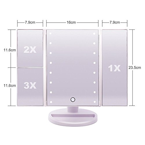 - 1X, 2X and 3X Magnifying Function: The cosmetic mirrors with magnification function, with 1X no magnification original specular reflection provides on the middle and right side. From middle mirror you can see your makeup state under lighting effect, and from right side mirror you can see the effect under normal light. Magnifying mirror on side 2X/3X can provide wide-angle viewing, perfect to see the tiniest beauty details, ensuring the best cosmetic experience.