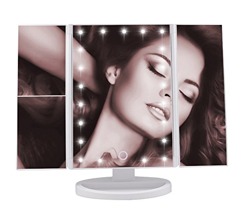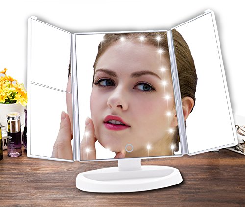 Kricson Tri-Fold Lighted Makeup Mirror with 21 LED Lights 1X/2X/3X Tri-Fold Magnifying Vanity Makeup Mirror with Touch Screen On/Off Cosmetic Folding Illuminating Portable HD Travel Mirror (White)