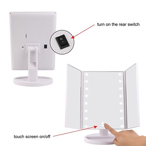 - 180 degree Rotation and Storage Design: The tri fold cosmetic mirror with stand can be 180°freely adjusted, to avoid the dust, you can close the mirror like a book and tri-fold and detachable design makes you can carry it during traveling. Also on the base there are a cabinet storage design, you can put the cosmetic brush or jewelries accessories on it whe you are put on makeup.