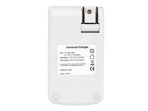 - Feature : Small size, stylish (piano varnish), compact design, convenient to carry and easy to operate. Charge time is about 3 hours / Innovative battery holder design, compatible with over 90% Single Cell Lithium Battery / Automatic detection of polarity. Automatically stops when battery is full. (Red = charging, Blue = fully charged) / Multi-connectors (folding plug and USB port) allow you to charge two batteries simultaneously / USB output: DC 5.0V, 600mAh / Desktop charging output: DC 4.20V, 600mAh.