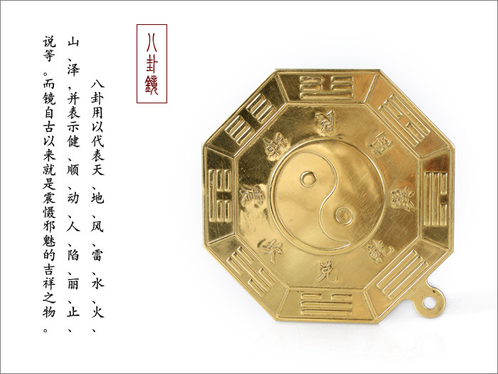 ? ? ? ?Also known as Tai Chi Bagua Bagua Mirror Mirror : The country has been known as feng shui mascot. According to legend, in ancient times dating back seven thousand years ago , Fuxi watching for images before making the gossip . . " To pass the gods of Germany, to the class of all things love" "Easy copulative Biography" , said: "Easy Tai Chi is two appearances , appearances of Health four images, four images and raw gossip ," Tai Chi is one , that is . Road , is totally strength of the elephant, is the root cause of heaven and earth . Yang Tai Chi movement was born , still born female , yin and yang are two appearances . The two appearances gave birth to a yin and yang as four images ( Shaoyang, old Yang , Shao , old yin ) . Four images is Yin and change in nature , but also on behalf of seasons seasons . The four images each born again yin and yang , it generates a gossip .