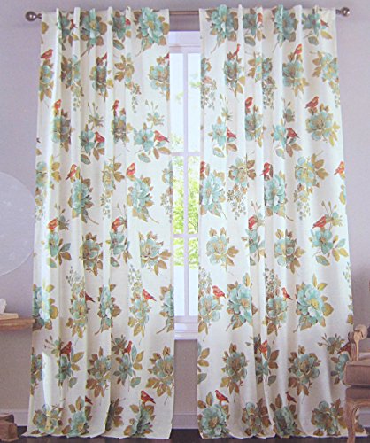 Envogue Window Curtains Birds Large Flowers 50-by-96-inches 100% Cotton Set of 2 Window Panels Pair Drapes Turquoise Gold Orange Teal Ivory Hidden Tabs Panels