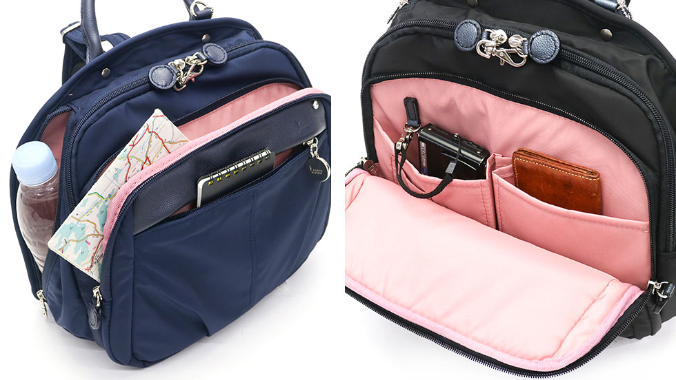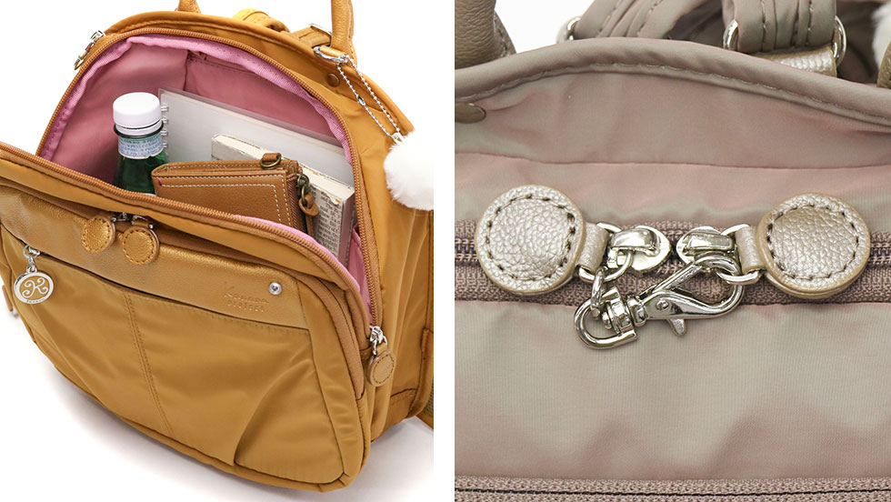 With many pockets inside and outside, small items that tend to be more often sorted and stored. In the zip pocket on the side, PET bottles to be put in and out frequently are contained, and it is a design which does not have to open the main room many times.