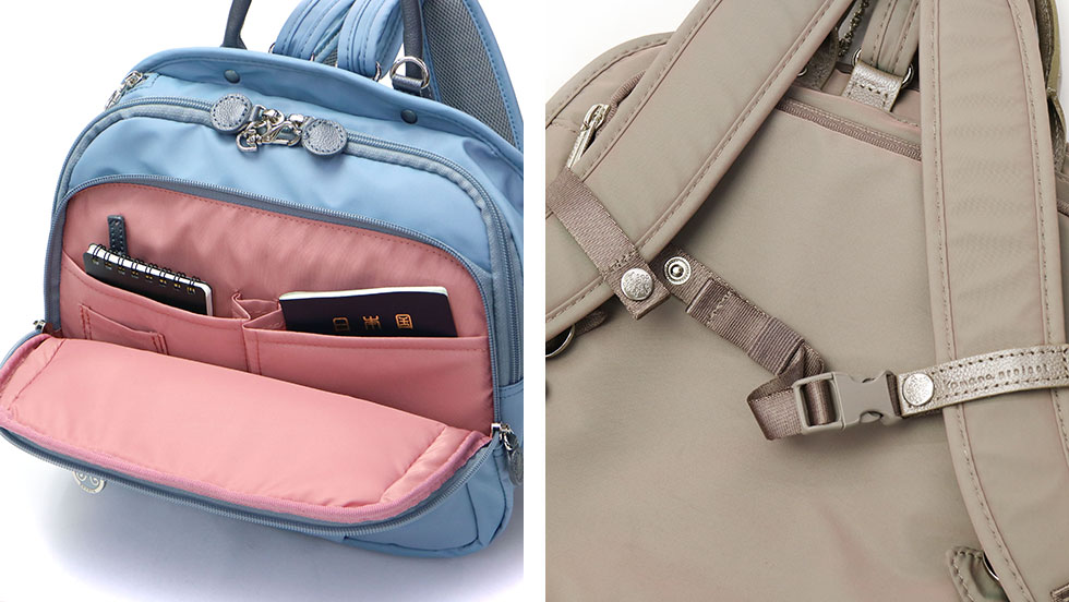 Snap removable chest strap can be removed and stored in a special pocket in the front pocket. Equipped with pockets that allow valuables to be placed in the back pocket close to the body, it has become a design that raises security even at train movements while carrying on the back.