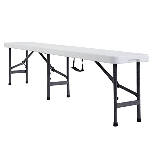 Studio : upersale Publisher : upersale Product Description Features: 1. Brand new and high quality 2. Perfect for outdoor party, picnic, camping, wedding 3. Durable, green environmental and recycled material HDPE 4. Waterproof top, resist acid, alkali and high temperature 5. Gray powder-coated, heavy duty steel wishbone legs 6. Rubbers on the legs prevent your floor from scratches or any damage 7. Light-weight, easy to move and store 8. Easy to clean Specifications: 1. Color: Off-white 2. Material: HDPE Top Steel Legs and Frame 3. Tube Size: 22 x 1 mm 4. Overall Dimensions: (71.26 x 12.01 x 17.13)" / (181 x 30.5 x 43.50)cm (L x W x H) 5. Tabletop Thickness: 2" / 5.08cm 6. Folded Dimensions: (35.4 x 12 x 4)" / (89.92 x 30.48 x 10.16)cm (L x W x H) 7. Seating Capacity: 4 People 8. Weight: 8.4kg / 18.52lbs Package Includes: 1 x Folding Bench 0