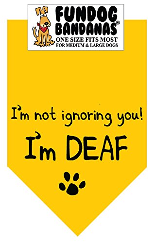 -. Binding : Misc. -. Brand : FunDog Bandanas -. Color : Gold -. EAN : 0083351957568 -. Feature : Cute! / Fun! / Affordable! / Makes a great gift! / 22x22x31inches -. Label : The Dog Perk Corporation -. Manufacturer : The Dog Perk Corporation -. MPN : Fun-7018 -. PackageQuantity : 1 -. PartNumber : Fun-7018 -. ProductGroup : Pet Products -. ProductTypeName : PET_SUPPLIES -. Publisher : The Dog Perk Corporation -. Size : One size fits most for medium to large dogs -. Studio : The Dog Perk Corporation -. Title : BANDANA - I'm not ignoring you! I'm DEAF. for Medium to Large Dogs - gold with black ink -. UPC : 083351957568