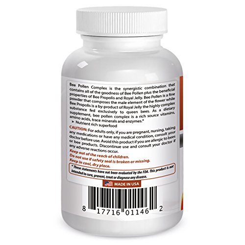 -. Binding : Health and Beauty -. Brand : Best Naturals -. EAN : 0817716011462 -. Feature : The Energy Supplements / Nutrient Rich Superfood / Genuine Whole Food / All 3 Bee Nutrients in One Convenient Tablet! Bee Pollen: 1000 mg. Bee Propolis: 10 mg. Royal Jelly: 10 mg / All Best Naturals products are manufactured in accordance with Good Manufacturing Practices (GMP), among the highest standards in the world -- Proudly Made in USA -- Purity & Potency Guaranteed -. IsAdultProduct : 0 -. Label : Best Naturals -. Manufacturer : Best Naturals -. PackageQuantity : 1 -. ProductGroup : Health and Beauty -. ProductTypeName : HEALTH_PERSONAL_CARE -. Publisher : Best Naturals -. Studio : Best Naturals -. Title : Best Naturals Bee Pollen Complex 1000 Mg 120 Tablets -. UPC : 817716011462