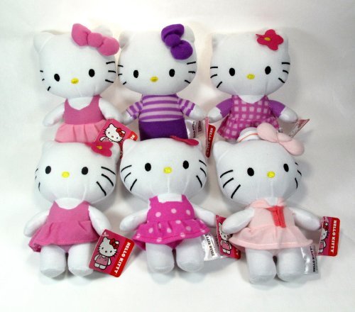 COMPLETE 6 PIECE SET OF 7.5 INCH HELLO KITTY PLUSH IN HER DIFFERENT OUTFITS.