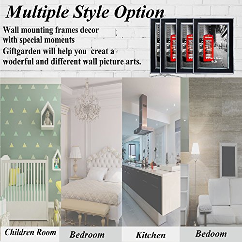 The picture frames kit consist of 4 piece black frames, and the overall size of frame is about 13.2x18.2 cm(5.2x7.17 inch), it holds 4x6 photos on a great view position.