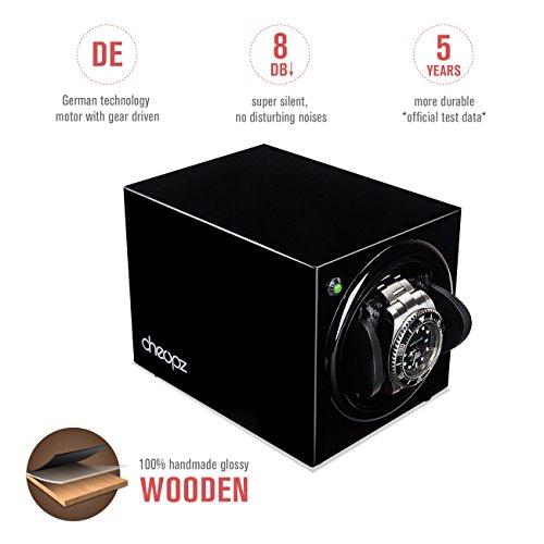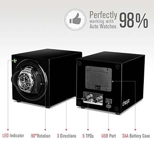 -. Feature : ULTRA SILENT - German technology motors with gear driven are better quality and more durable, being extra super silent when rotating your automatic watch. Perfect to use in the bedroom. No disturbing noises or magnetization to harm watches. / INTELLIGENT WATCH PROTECTION - 5 TPD (650/750/850/1000/1950) & 3 rotation directions (clockwise, counterclockwise and bi-directional) settings match different watches; with a 12h active phase & a 12h resting phase, the watch winder protects the automatic mainspring; LED indicator shows the winder status. / USB DUAL POWER - Powered by USB V2.0 cable or 2 AA batteries (not included), more convenient to place watch winder in a study room/office or in a safe; serial connector cable connects multiple winders by only one power source. / ADJUSTABLE HOLDER - Especially designed to rotate larger and heavier automatic watches more securely with the "lock-in" watch holder and to wind your watch more scientifically and professionally with the vertical watch holder position. / HANDMADE HIGH QUALITY - 100% handmade single wooden watch winder, NOT plastic finished, but with black high-gloss lacquer exterior and carbon fiber faux leather interior, offers 2-YEAR warranty and excellent customer service.