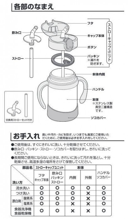 | 素材・材質 | 内びん:ステンレス鋼 胴部:ステンレス鋼(アクリル樹脂塗装) フタ・キャップ本体・ハンドル:ポリプロピレン 飲み口・ストロー・パッキン・ソコカバー:シリコーン |