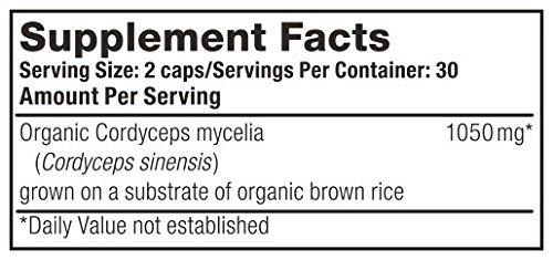 -. Feature : This premium organic Cordyceps is cultivated in the Pacific Northwest. / Fresh Cordyceps mycelium is grown in organic brown rice under strict laboratory conditions / The gentle freeze-drying technique preserves the natural constituents present in Cordyceps. / Certified Organic Cordyceps. / Gluten-Free. GMO-Free. Herb Identity Guaranteed. 100% Vegetarian. Pure: No fillers, or other chemicals have been added.