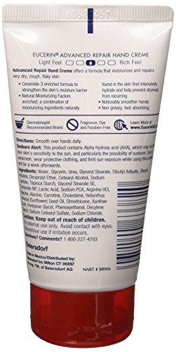 Eucerin Intensive Repair Extra-Enriched Hand Creme.Eucerin Intensive Repair Extra-Enriched Hand Crème.Repair dry, rough hands and cuticles with a crème specially formulated to moisturize and protect.This unique, non-greasy formula intensively moisturizes, and is enriched with buffered alpha hydroxy to gently exfoliate. Discover noticeably smoother hands after just one application.Sunburn Alert: This product contains alpha hydroxy acid (AHA), which may increase your skin’s sensitivity to the sun, and particularly the possibility of sunburn. Use a sunscreen, wear protective clothing, and limit sun exposure while using this product and for a week afterwards.Key Features.Dermatologist recommended.Repairs and gently exfoliates dry, cracked skin on the hands and fingers.Noticeably smoother hands after just one use.Non-greasy, fast-absorbing.Relieves dry skin associated with hand eczema.