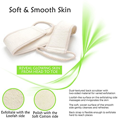 - Loofah Back Scrubber:Lengthened handle loofah back scrubber made of natural organic luffa ,lightweight and good elastic can strench to cleansing your back .Easy and convenient for shower .Special design with two sided technology:,one side offers a textured surface that deeply exfoliates; the other side features a soft, smooth microfiber surface for delicate skins.