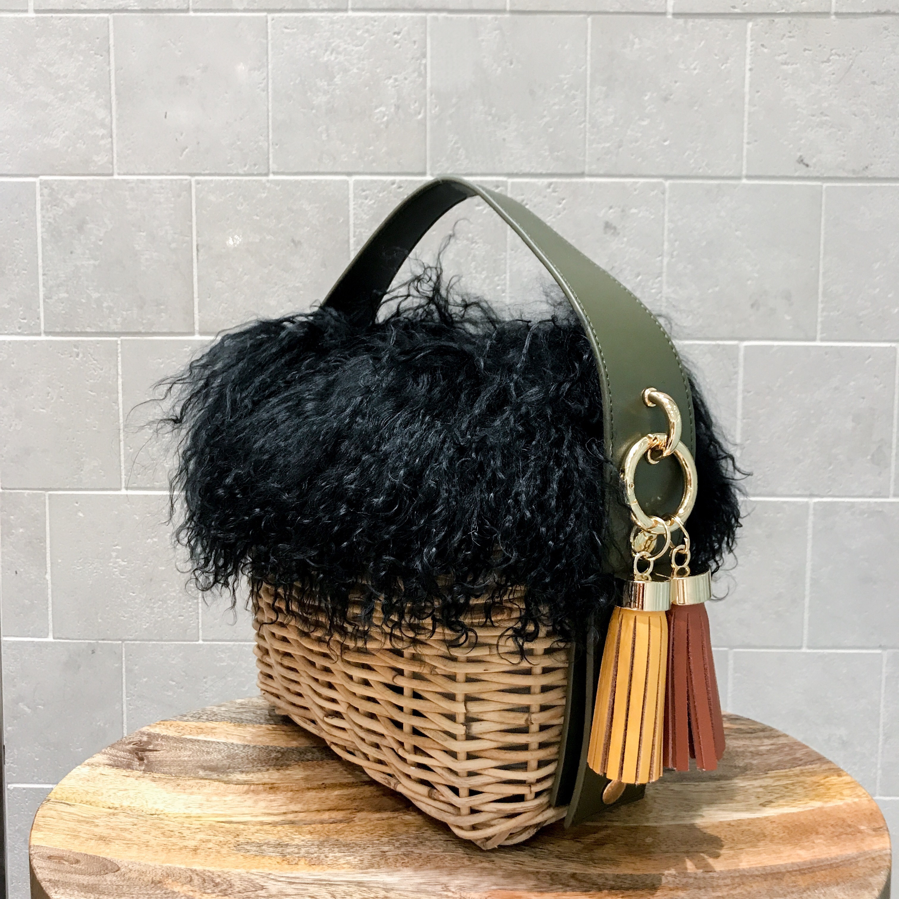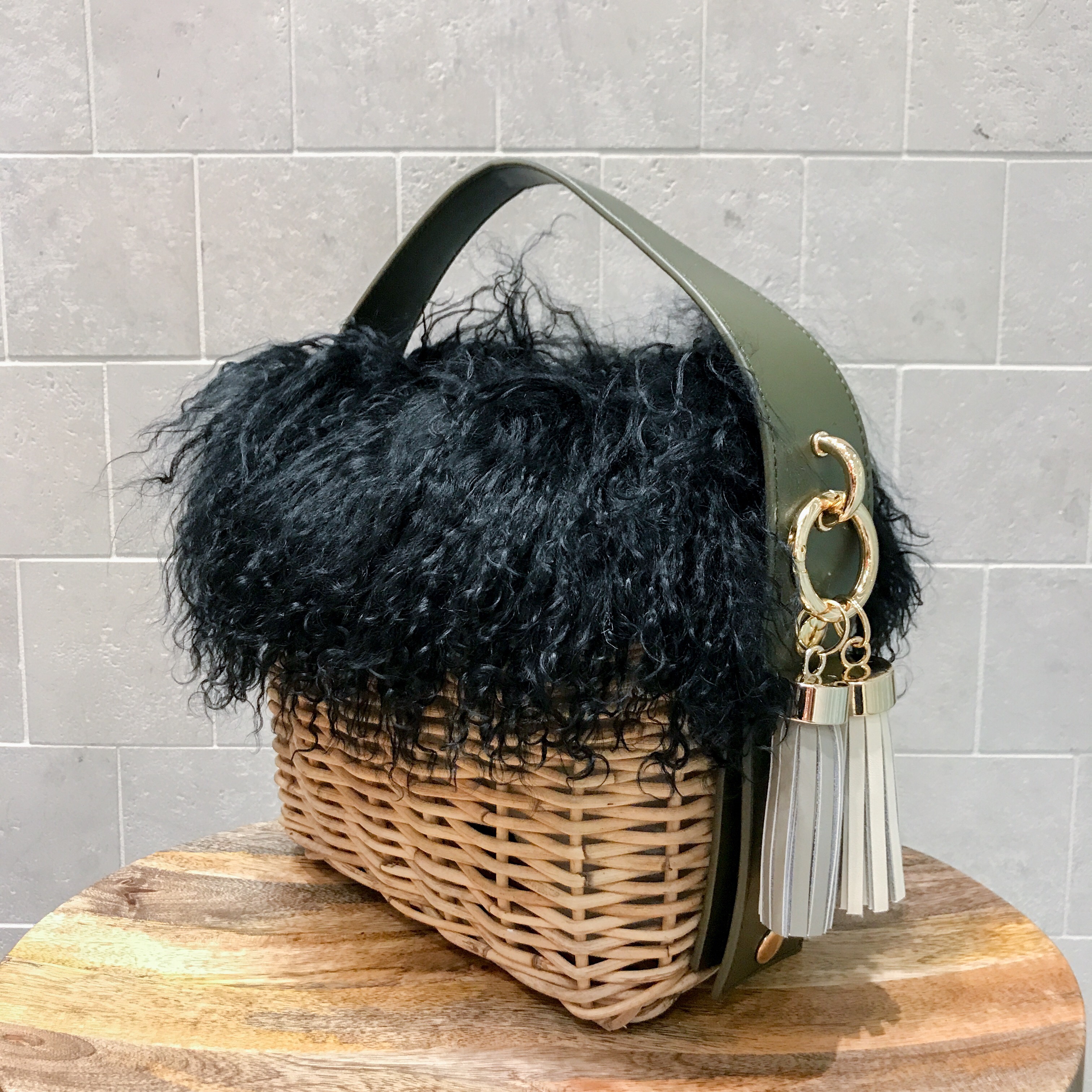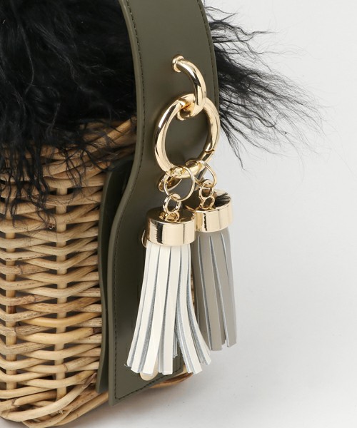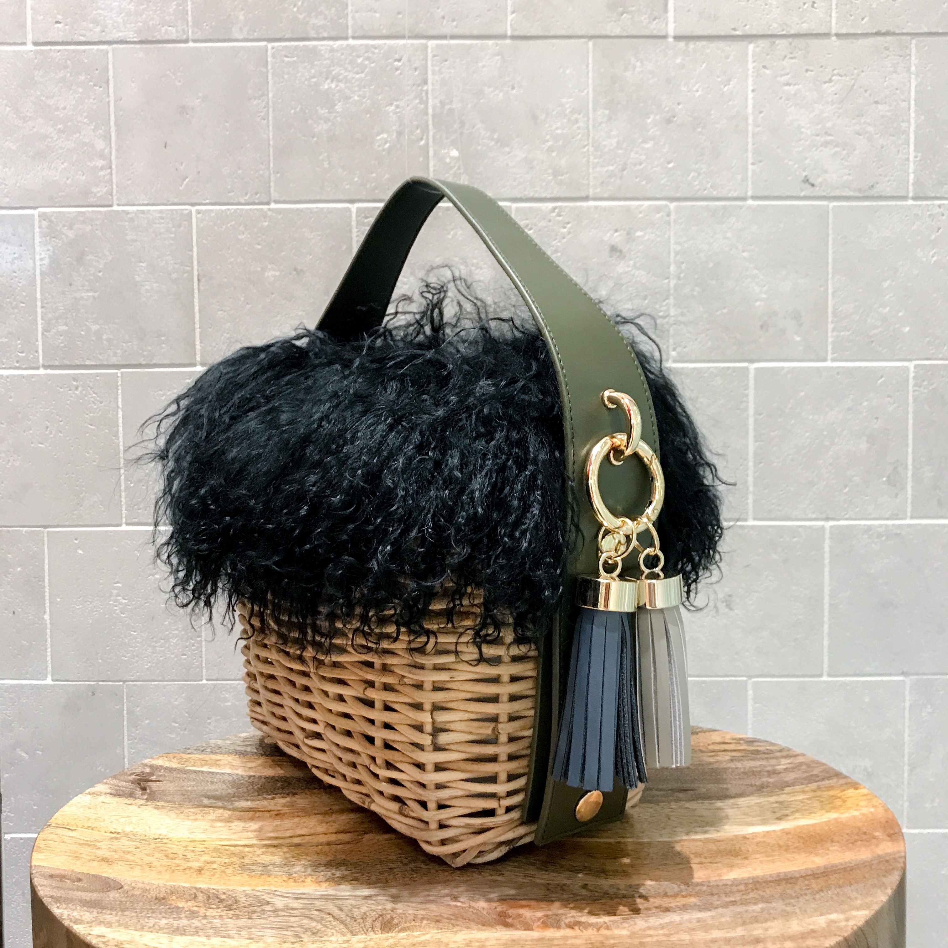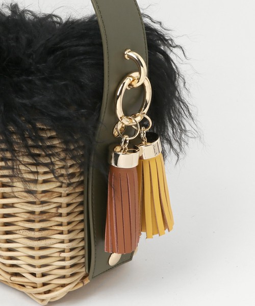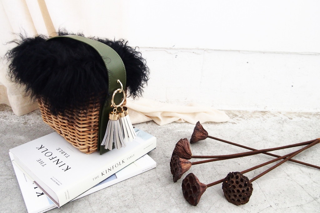 【素材】カゴ部: 紅籘, レザー部: 牛革, ファー部: フォックスファー(グレー, バーガンディー), チベットラム(ブラウン, オリーブ)