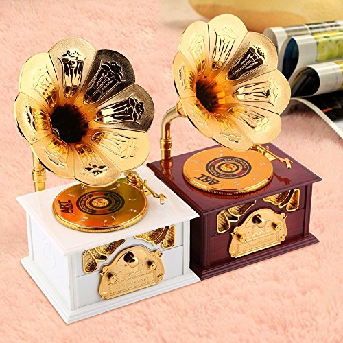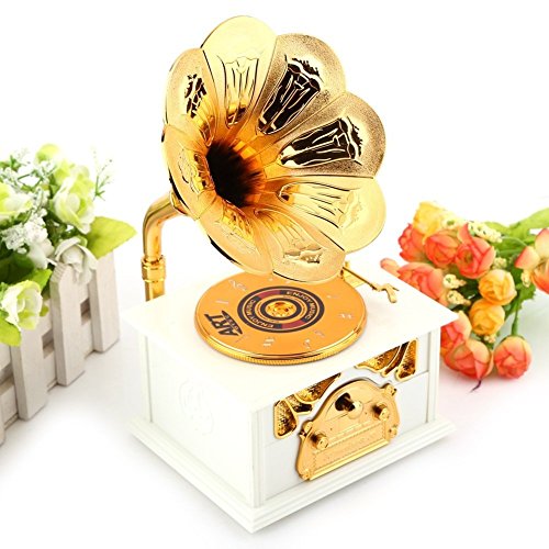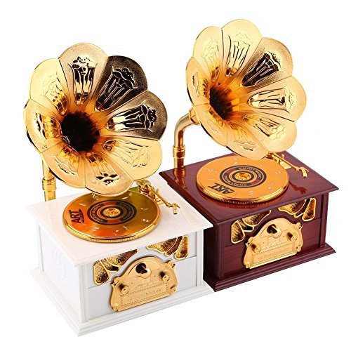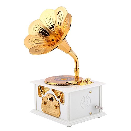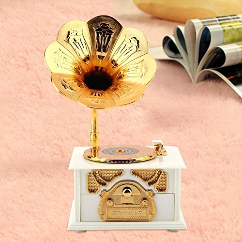 Retro Wind Up Gramophone Phonograph Music Box Classical Trumpet Horn Creative Home Decoration Kids Toys Gifts (Ivory White)