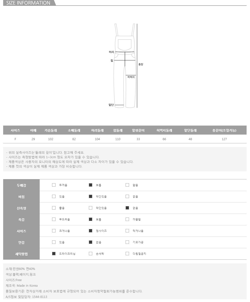 얇으면서도 탄탄한, 시원하면서도 쾌적한! 매년 여름이 되면 어김 없이 찾게 되는 린넨 소재에 부드러운 코튼이 혼방되어 일상 시에 생기는 구김은 어느정도 완화되면서 소프트한 착용감에도 효과적이라는 사실! 또한, 넉넉하고 여유있는 실루엣으로 부해보이지 않게끔 딱 귀엽고 사랑스러운 핏을 유지해드릴 뿐만 아니라 숄더 라인 끈을 자유롭게 묶어서 연출하실 수 있어 체형에 맞게 길이 조절도 무리 없이 OK~ 양 사이드 포켓으로 간편한 실용성까지 한껏 끌어모았음은 물론, 기본 티셔츠와 함꼐 가볍게 매칭해주시면 누가 봐도 패셔너블한 스타일링을 완성하실 수 있어 데일리 점프수트로 추천드릴게요:)