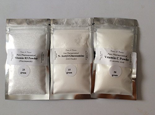 -. Feature : B3 (Niacinamide): apply Niacinamide topically has been shown to benefit skin color, decrease melanin synthesis, suppresses hyper-pigmentation, and decrease inflammation and itching. It is a potent cell-communicating ingredient. It can improve skin's elasticity, dramatically enhance its barrier function, help erase discolorations, and revive skin's healthy tone and texture. / Niacinamide also has a growing reputation for being able to address skin discolorations and to reduce acne. Niacinamide often used in tandem with other proven skin-lightening agents such as Vitamin C and Gluosamine. / NAG (N-Acetyl-Gluosamine) is considered to be a "skin identical ingredient", meaning it is found in our skin in the spaces between the cells, and it is used to maintain skin's barrier abilities and reduce dryness. Studies have shown that NAG can increase collagen production, increase moisture content of the skin, increase elasticity of the skin, increase exfoliation, and increase the speed of wound healing. / Vitamin C (l-ascorbic acid) is a potent anti-oxidant, protects skin from oxidative damages. It has anti-aging effects ,improves skin elasticity by enhanced collagen production, It can avoid hyper pigmentation including age spots. It has anti-inflammatory and soothing effects. / Pure Powder No fillers.Enough for about 8 fl. oz of lotion or Serum.