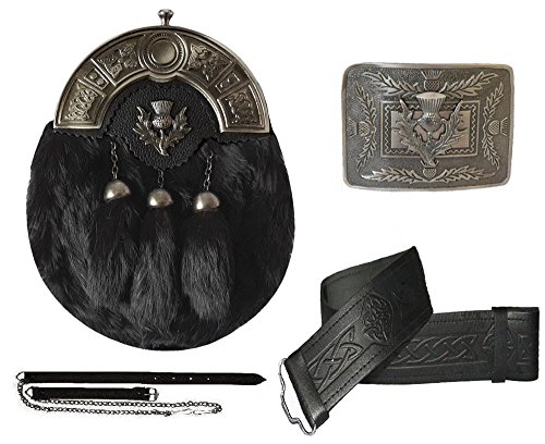 Product Description Kilt Accessory 4 Piece Set A quality Scottish Kilt package to complete your outfit. Also makes a great gift. This set includes the following items: 1. Full Dress Fur Sporran This is a high quality handmade sporran. The front consists of fur and the back of sporran is made from leather and has an attachment for the chain belt to attach the sporran. The sporran features a celtic design antique finished cantle and has 3 tassles made of quality fur and has ample room inside for a mobile, lighter, wallet, etc. 2. Embossed Leather Kilt Belt This is genuine cowhide leather kilt belt. The leather on these belts is fantastic quality and has a smooth finish! The width is approx. 2.25inches and it has a traditional slip end so you can easily interchange the buckle if required. The belt is also fully adjustable to fit different waist measurements and is available in a choice of sizes, as follows: Available in size: Small (to fit waist 30" upto 36") Medium (to fit waist 36" upto 42") Large ( to fit waist 42" upto 48" ) 3. Sporran Chain Strap The sporran chain belt is made of black leather and two antique finish chains with buckle. The chain belt is fully adjustable and can fit any size from 28" upto 48" waist. 4. Kilt Belt Buckle Quality antique kilt belt buckle with a raised thistle design. Brand New We sell only high quality products and promptly dispatch within 1 to 2 working days. Please check out our other items! and be sure to add us to your favourites list! 0