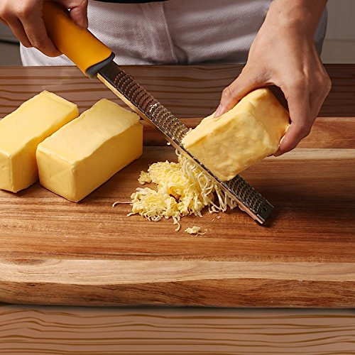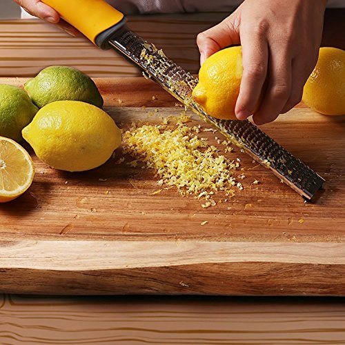 iYaYoo Premium Stainless Steel Lemon Cheese Zester Grater FDA Approved with Safety Plastic Cover and Cleaning Brush, For Cheese, Lemon, Ginger, Garlic, Onions, Chocolate,Yellow Handle