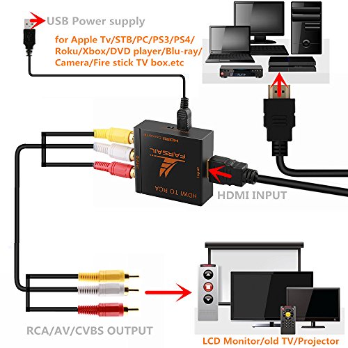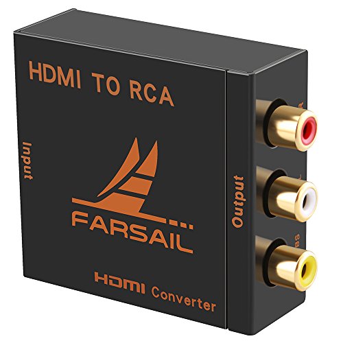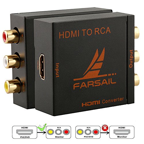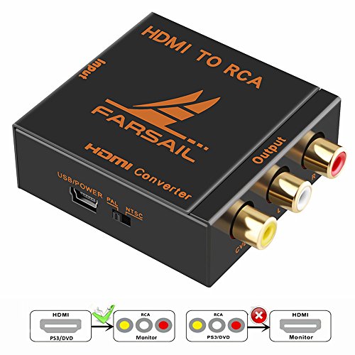 【HDMI to RCA Converter】Farsail MINI HDMI to AV signal converter which will convert HDMI video signal or audio signal to AV (CVBS) composite video signal and the FL / FR stereo audio signals.Updated New software program to be compatible with more sink device and solved the issue of picture in black and white in few devices; Easily works with the traditional TV produced in North America or most of the rest of the world.