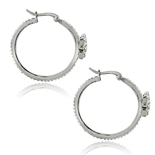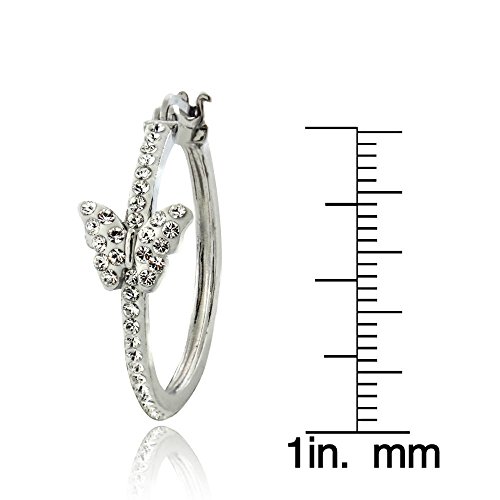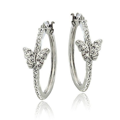 ELEGANT LUXURIOUS DESIGN EARRINGS - Silver flashed hoop earrings with a butterfly cluster created with sparkling clear Swarovski crystals stones are pave set in a loop design crafted in a hypoallergenic nickel free brass setting and is secured with a snap down post hanging size is 28.6mm in diameter