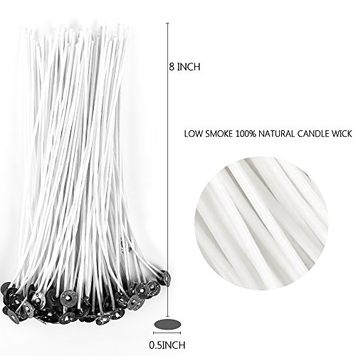 - CANDLE WICKS: 100 PCS, 8 inch in length. Metal tab base dia:12.5mm. Low smoke 100% natural cotton mixed paraffin wax candle wicks, no lead, zinc or other metals. No black smoking and Burning Stability when burning.