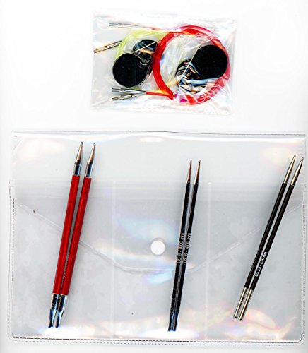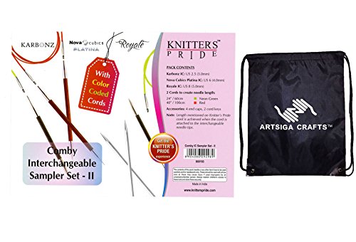 Bundle includes 1 Knitter's Pride Comby Sampler Set 1 Interchangeable Long Tip Knitting Needles with 1 Artsiga Crafts Project Bag 800193; set includes 3 pairs of Interchangeable needles and assessories; 1 x Karbonz IC US 2.5 (3.0mm), 1 x Royale IC US 8 (5mm), 1 x Nova Cubics Platina IC US 6 (4.0mm), 2 cords (24" and 40") and 2 cord keys packed in clear vinyl case