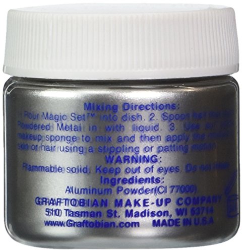 Studio : Graftobian Publisher : Graftobian Binding : Health and Beauty Product Description Graftobian powdered metals are a great way to infuse great energy and enthusiasm into your face and body painting. Make your painting pure fantasy with this popular metallic makeup; it's easy to apply for stunning results. Make it metal with this product. You must use Graftobian Cosmetic Powdered Metal with Magic Set Mixing Liquid (sold separately). After mixing, you have a metallic paint that gives stuffing results. Use just a little of the mix to line eyes or accent face paint designs or go all the way with 2 bottles of Powdered Metal with twice as much Mixing Liquid to paint an entire body. You can make yourself into a statue or character, like the tin man. Applied wet, Powdered Metal dries to an opaque and highly durable finish. Comes in a 0.5 ounce size. 0
