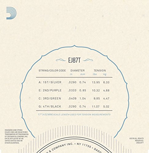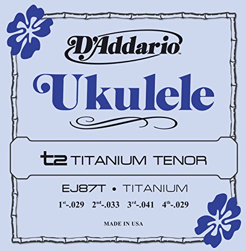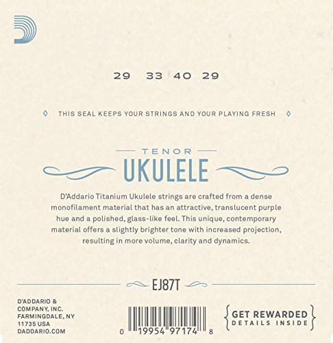 Studio : D'Addario Co. Inc Publisher : D'Addario Co. Inc Binding : Electronics Product Description D'Addario EJ87T sets are designed for use with tenor ukuleles utilizing our bright sounding titanium material. This set is optimized for standard GCEA tuning.D'Addario Titanium Ukulele strings are crafted from a dense monofilament material that has an attractive, translucent purple hue and a polished, smooth feel similar to nylon. This unique material is particularly beneficial to Ukulele's due to its slightly brighter tone and increased projection, resulting in more volume, clarity and dynamics.D'Addario, the world's largest manufacturer of musical instrument strings, is known as The Players Choice with a reputation for unsurpassed quality and consistency. D'Addario's innovative packaging reduces waste and provides protection from corrosion. All D'Addario strings are manufactured in the U.S.A. using proprietary, digitally controlled, state-of-the-art machinery for unmatched performance, set after set. 0