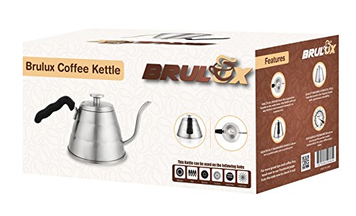 Made from the finest materials, Brulux's stainless steel pour over coffee kettle can offer you an unforgettable experience in brewing homemade coffee or tea. Light in weight, yet sturdy to the touch, it's designed to be used in a variety of stoves such as gas, electric, halogen, induction or ceramic plate.