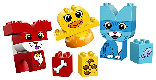-. Binding : Toy -. Brand : LEGO -. EAN : 0673419282567 -. Feature : Features 3 color-coded, buildable puzzles: a bird, cat and a dog. / Includes bricks decorated as food for each pet as play starters. / Help your child master basic building skills with these simple puzzles. / Have fun together as your child learns how to recognize and sort colors, then match the food to each animal. / Inspire imagination with this versatile toy as toddlers make up their own stories with the cute pets. -. Label : LEGO -. Manufacturer : LEGO -. Model : 6212842 -. MPN : 6212842 -. NumberOfItems : 1 -. PackageQuantity : 1 -. PartNumber : 6212842 -. ProductGroup : Toy -. ProductTypeName : TOYS_AND_GAMES -. Publisher : LEGO -. ReleaseDate : 2018-01-01 -. Studio : LEGO -. Title : LEGO DUPLO My First My First Puzzle Pets 10858 Building Kit (18 Piece) -. UPC : 673419282567 -. Warranty : No Warranty