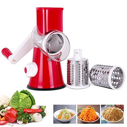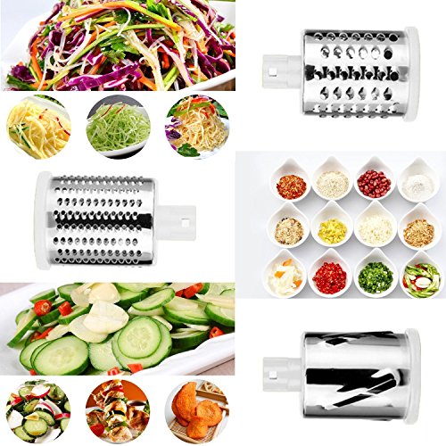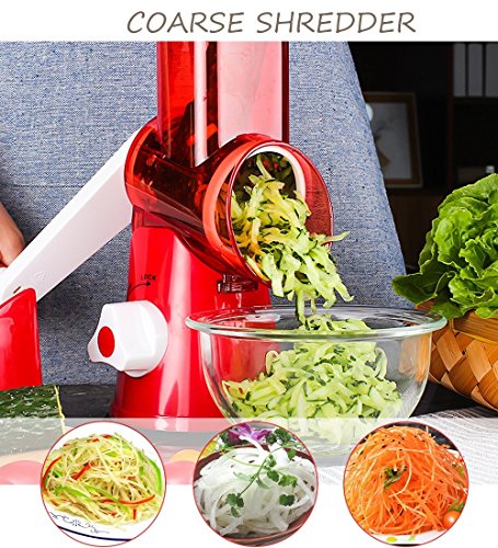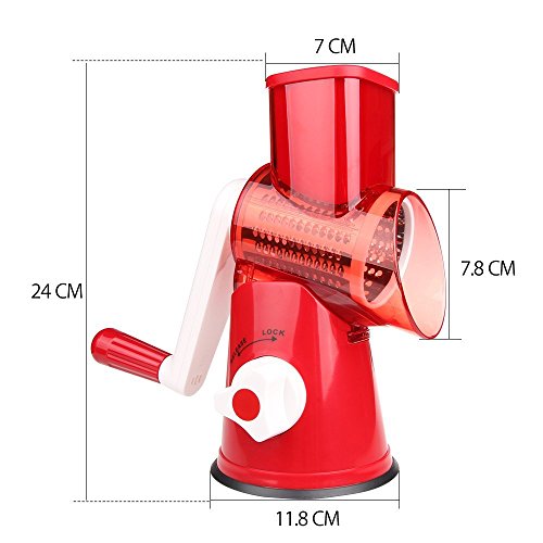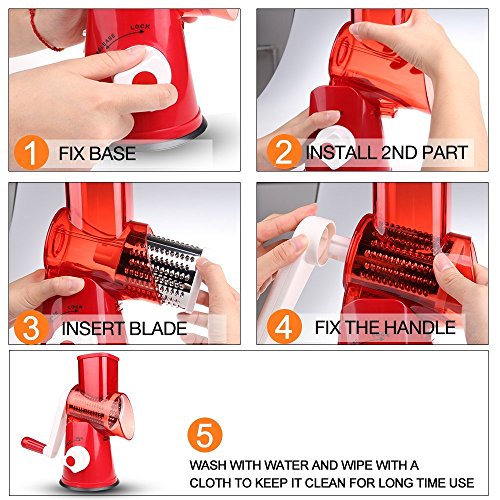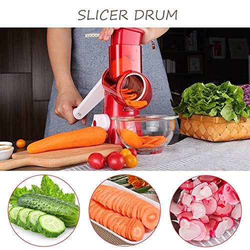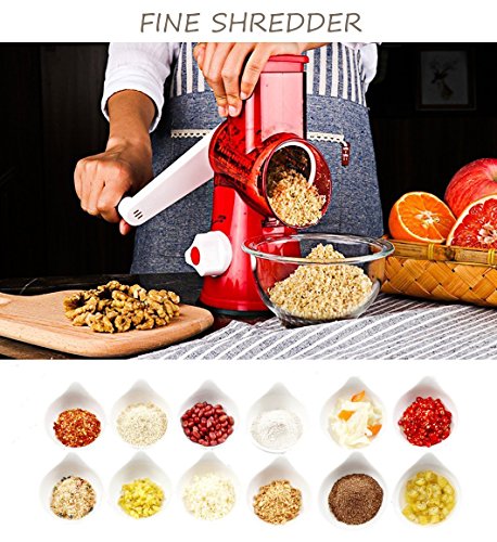 ✔ USE - A suction base grips securely to clean, smooth areas for effortless grating with a simple turn of the handle, the round drum slicer sits diagonally, so the grated pieces fall out from this rotary cheese grater by themselves, reduces any clogging.