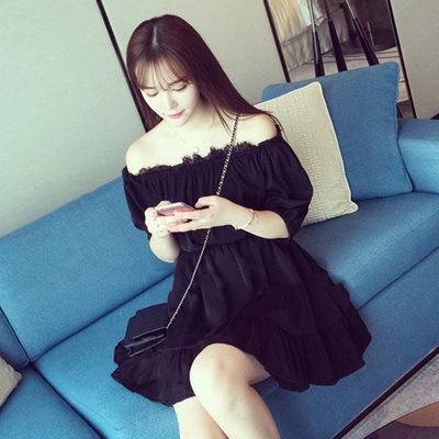 韩版气质蕾丝一字领套头雪纺娃娃裙A字连衣裙短裙女