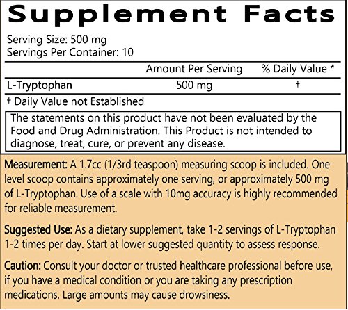 -. Feature : BOOSTS MOOD - L-Tryptophan Bulk Powder benefits include its wonderful ability to boost your mood through increasing serum serotonin levels / PROMOTES HEALTHY SLEEP AND RELAXATION - People use L-Tryptophan for sleep because of its ability to improve melatonin levels in your brain / GREAT HEALTH BENEFITS - Clinical studies have indicated that L-Tryptophan has numerous secondary health benefits and can be used safely for kids, dogs, and cats / 100% VEGAN AND VEGETARIAN FRIENDLY- This L-Tryptophan supplement contains no animal products whatsoever / NO ADDITIVES - Our 99+% Pure L-Tryptophan is free from additives, fillers, preservatives, lactose, and gluten. It is tested by independent 3rd party laboratories in the US and ships with a Certificate of Analysis to ensure the highest quality