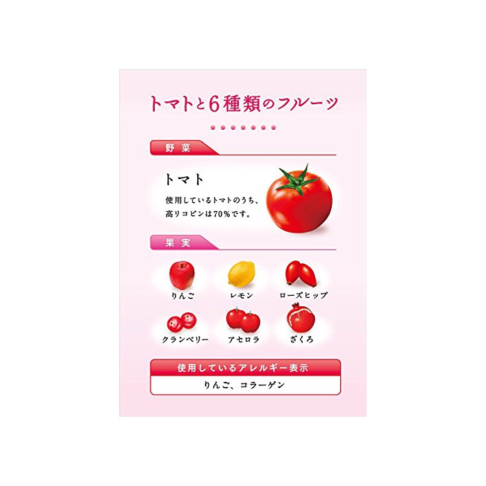 원재료:토마토,과실(사과,레몬,로즈 힙,크랜베리,《아세로라》,석류)고, 콜라겐 펩티드(젤라틴)고, 《피로린》산 제2철