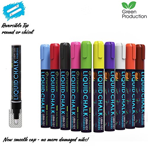 Liquid Chalk Markers Set (10 Pens) by Urbamade. Non Toxic, Water Based Art Supplies for Kids, Crafters and Teachers - Safe, Odorless and Erasable. Includes 40 Chalkboard Labels and Cleaning Cloth