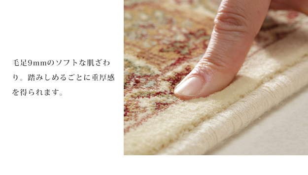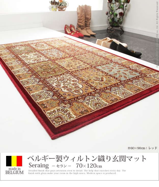 ※メーカー直送のため代金引換はお受けできません。※沖縄・一部離島は別途送料がかかります。お見積もりいたしますのでお問い合わせ下さい。商品について:レーヨンの細く柔らかい繊維を100万ノットの高密度で織り上げたベルギー製の玄関マット。繊細なデザインや光沢感、ソフトな肌触りが快適です。伝統的なベルシャデザインのヘシテイ柄は、玄関をゴージャスな雰囲気に演出してくれます。サイズ(cm):幅70x奥行120cm・約3.5kgカラー:アイボリー・レッド材質:レーヨン100%株式会社ナカムラ(51000069)