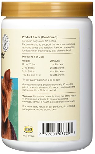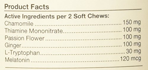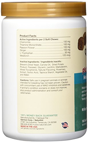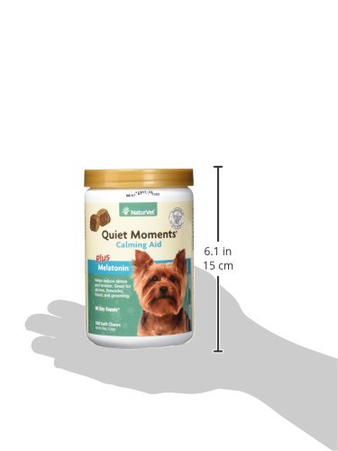 NaturVet Quiet Moments Calming Aid Plus Melatonin Helps Support the Nervous System in Reducing Stress and Tension and Helps Promote Rest and Relaxation. Our Unique Blend of Thiamine and L-tryptophan Helps to Reduce Stress and Tension, Ginger Supports Sensitive Stomachs while Melatonin Helps to Promote Rest and Relaxation. Recommended for Dogs When Traveling by Car, Plane or Boat, also Great for Storms, Fireworks, Grooming or Boarding. Wheat Free, Tasty Soft Chews 70ct for Dogs Over the Age of 12 Weeks. Give 30 Minutes Prior to Stressful Situation. Do Not Exceed Double the Daily Amount in a 12-hour Period. Active Ingredients per 2 Soft Chews: Chamomile, Thiamine Mononitrate, Passion Flower, Ginger, L-Tryptophan and Melatonin. All NaturVet Products are Veterinarian Formulated and Manufactured in the USA in an FDA Audited, cGMP Compliant Facility with a 100% Satisfaction Guarantee.