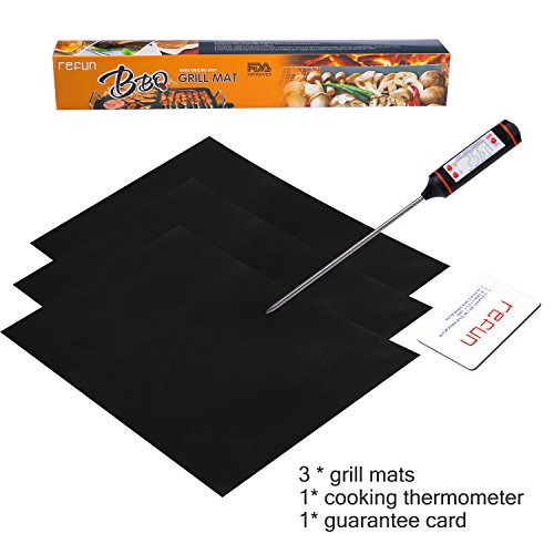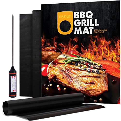 Refun BBQ Grill Mat Set of 3, FDA Approved Non-stick Baking Mats, 16 X 13 Inch, Works on Gas, Charcoal and Electric Grills etc, Free Grill Thermometer Included