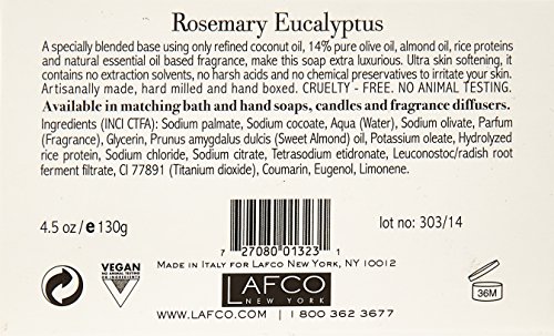 The Perfect Soap. LAFCO’s bar soap is artisinally made in Italy and is the result of over 20 years of experience in the soap and body care industries. Our unique formulation produces a moisturizing and creamy lather that leaves a layer of nourishing oil on your skin, which remains long after washing. Our solvent-free soap is made with an extraordinary 14% olive oil, almond oil, and rice proteins. It is hard milled, air dried (to make it extra long lasting) and scented with essential oil based fragrance. Hypoallergenic and free of: BHT, EDTA, parabens and sulfates. Perfect for sensitive skin and skin prone to redness or irritation as it contains no harsh chemicals or preservatives.Feature