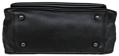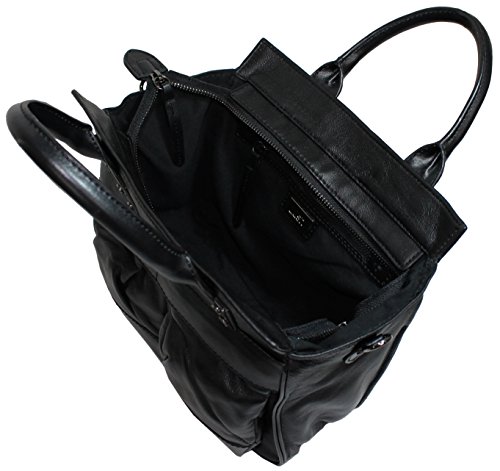 Outside: 4 protective feet, two front pouch pocket with snap button closure, large back zippered compartment Inside: Two flat patch pockets, zippered compartment and dual zippered closure